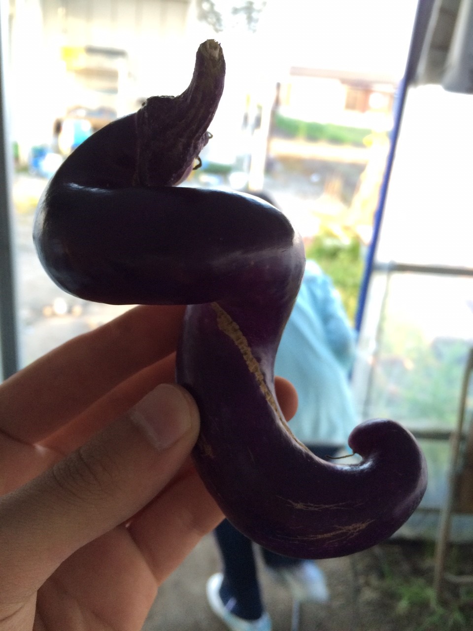 佐藤久一さんの育てていらっしゃる長なすはまっすぐ育つことがまずなく、曲がったりしているのが普通な品種だそうですっ